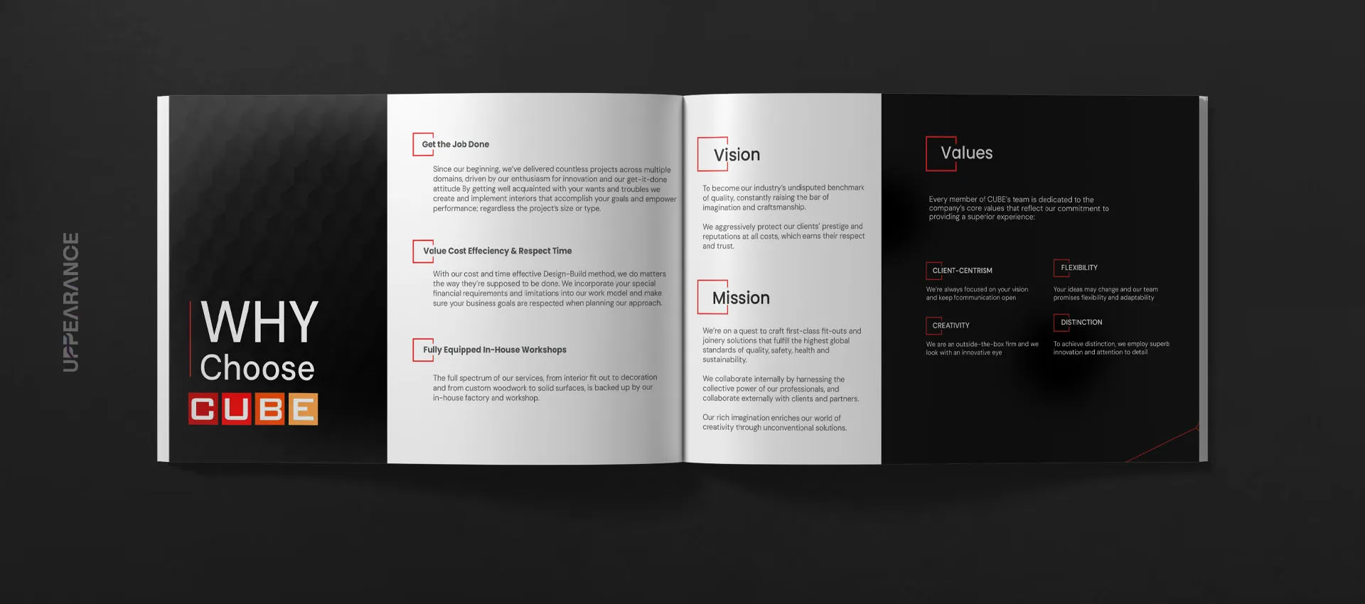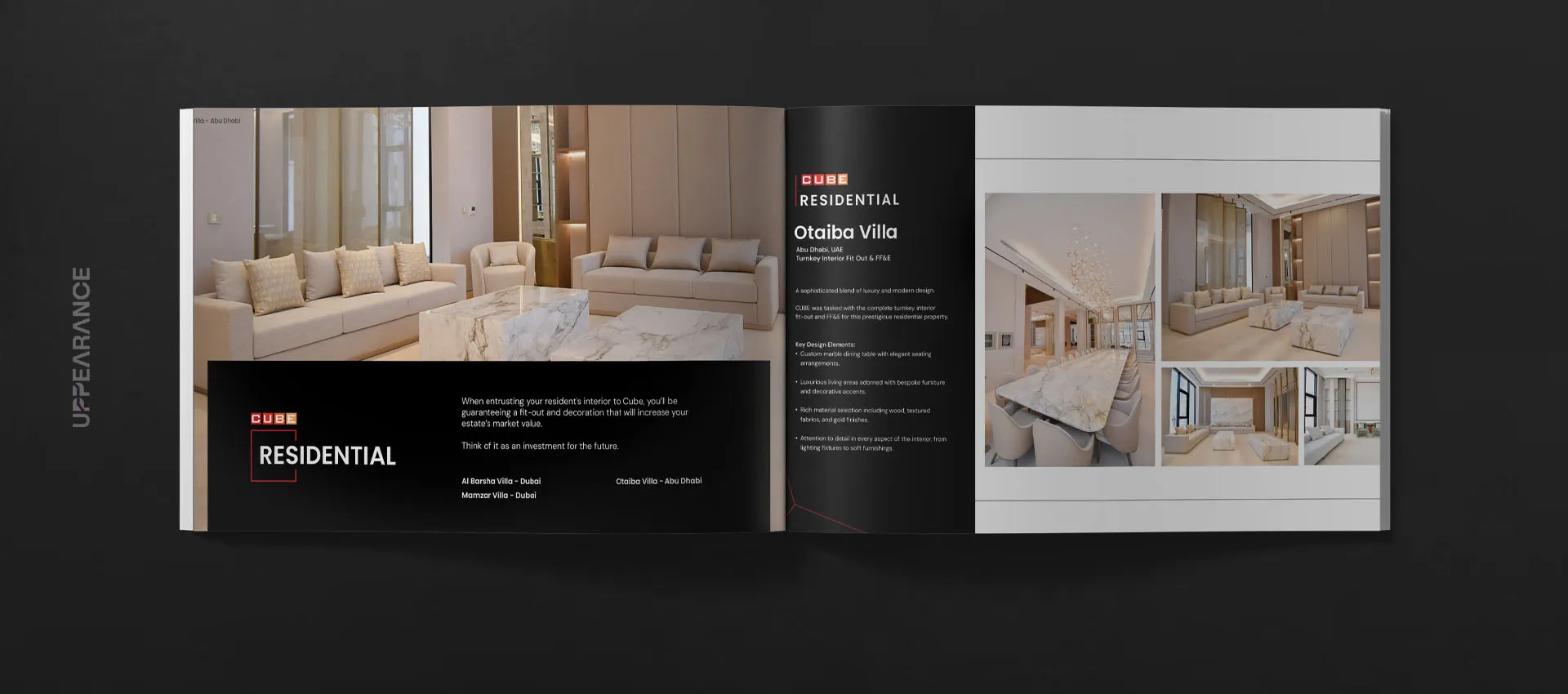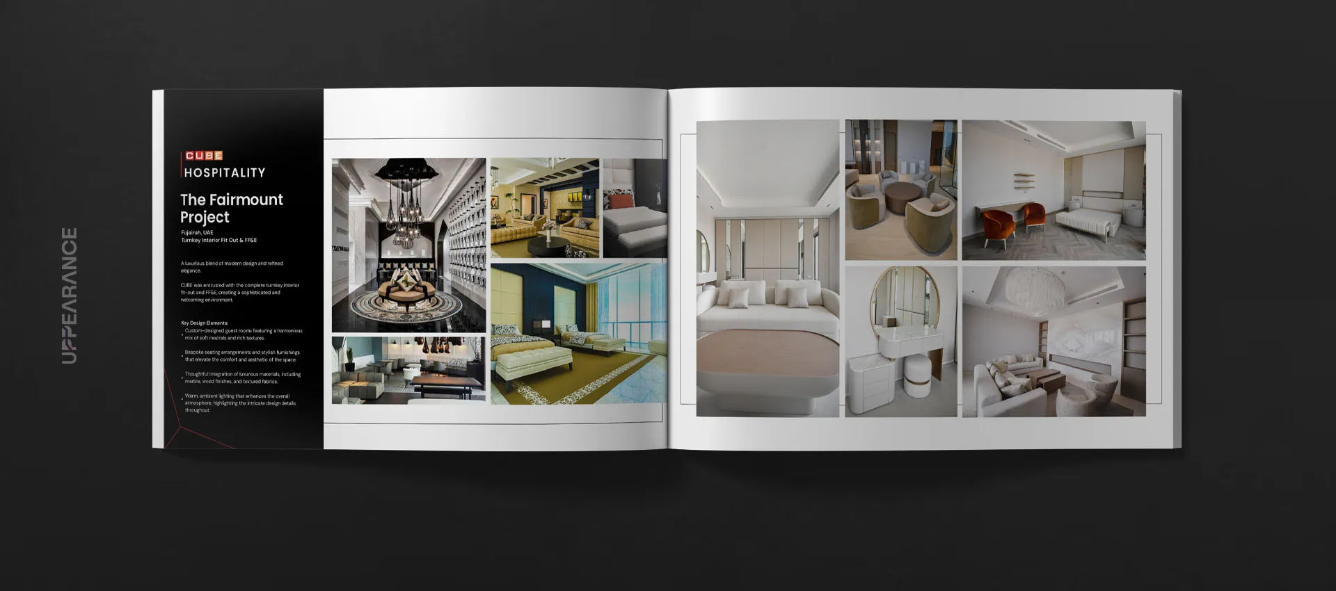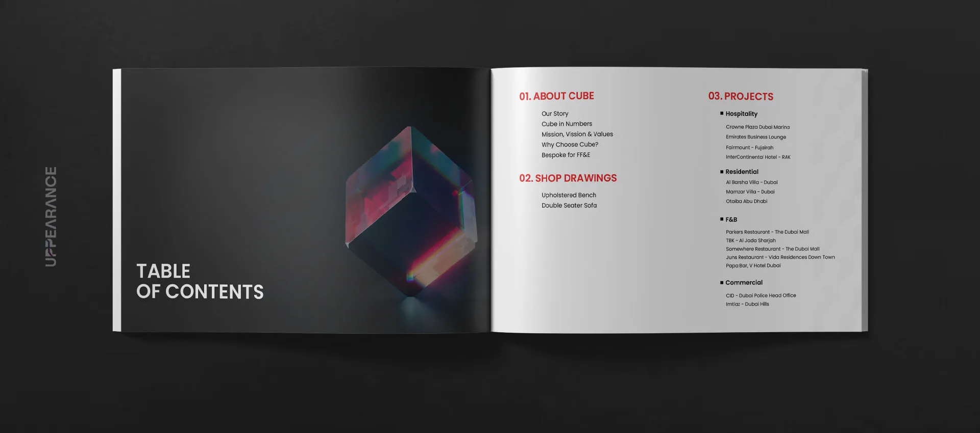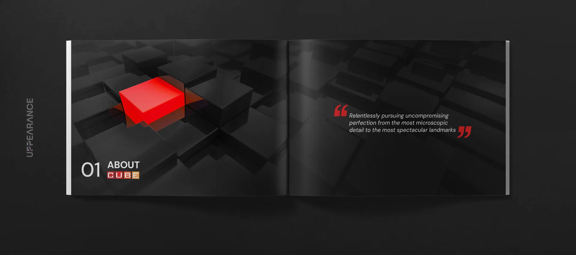 Uppearance designed a professional presentation for Cube, an Interior Design & Fit-Out brand. The presentation showcased their creativity and portfolio of projects, creating a cohesive and client-ready identity. Through clear and consistent design, Uppearance strengthened Cube’s credibility and helped position them as a trusted name in the interior design industry.