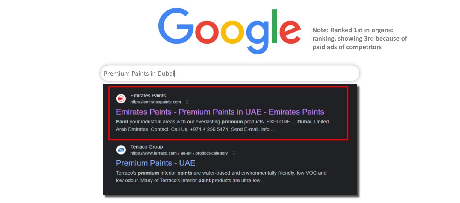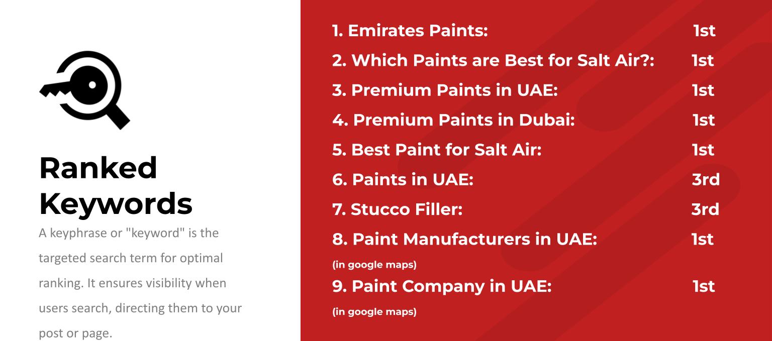 Emirates Paints partnered with Uppearance to strengthen its online presence and achieve sustainable SEO growth. Our team developed a targeted strategy that focused on ranking valuable industry keywords, improving domain authority (DA) and page authority (PA), and increasing visibility through Google’s AI Overview. By combining in-depth keyword research, on-page optimization, and high-quality backlink building, Emirates Paints achieved measurable improvements in search performance and credibility.